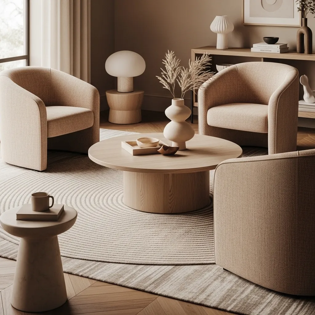 - Choose curved seating: Look for barrel chairs or sofas with rounded edges.