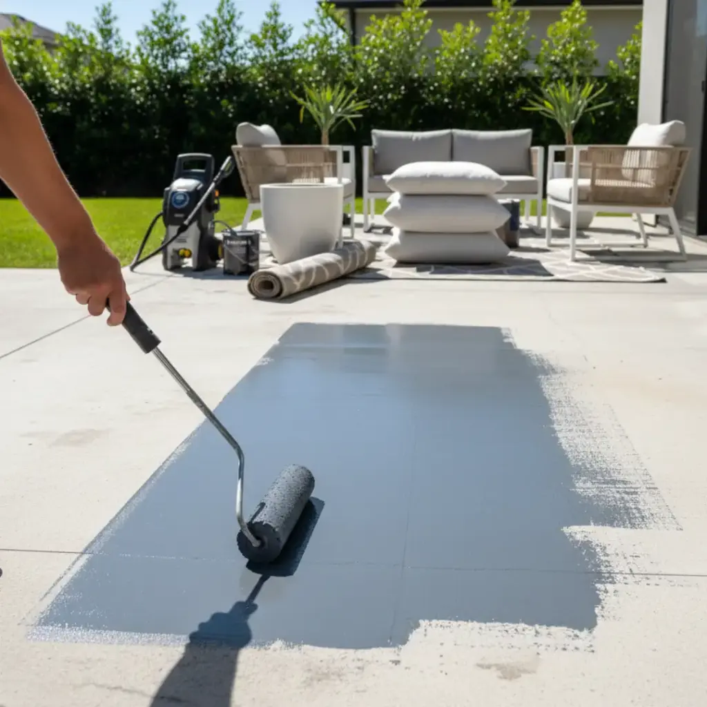 That grey, stained concrete slab is likely the reason your patio feels like a parking lot. I used a heavy-duty porch and patio paint to turn mine into a sleek, slate-colored foundation
