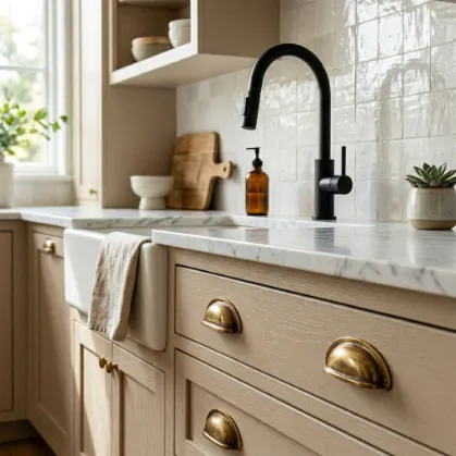 Buying everything in brushed nickel shows zero imagination. I mixed unlacquered brass pulls with a matte black faucet, and the contrast looks incredible.