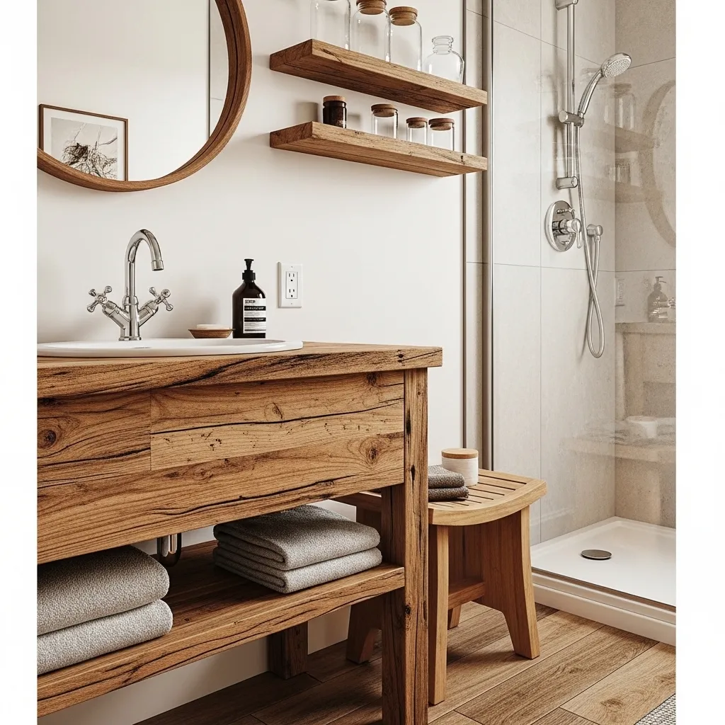 Swap that generic particle-board cabinet for something with a bit of grain and history. Raw or reclaimed wood brings an organic element that balances out the cold porcelain of the sink