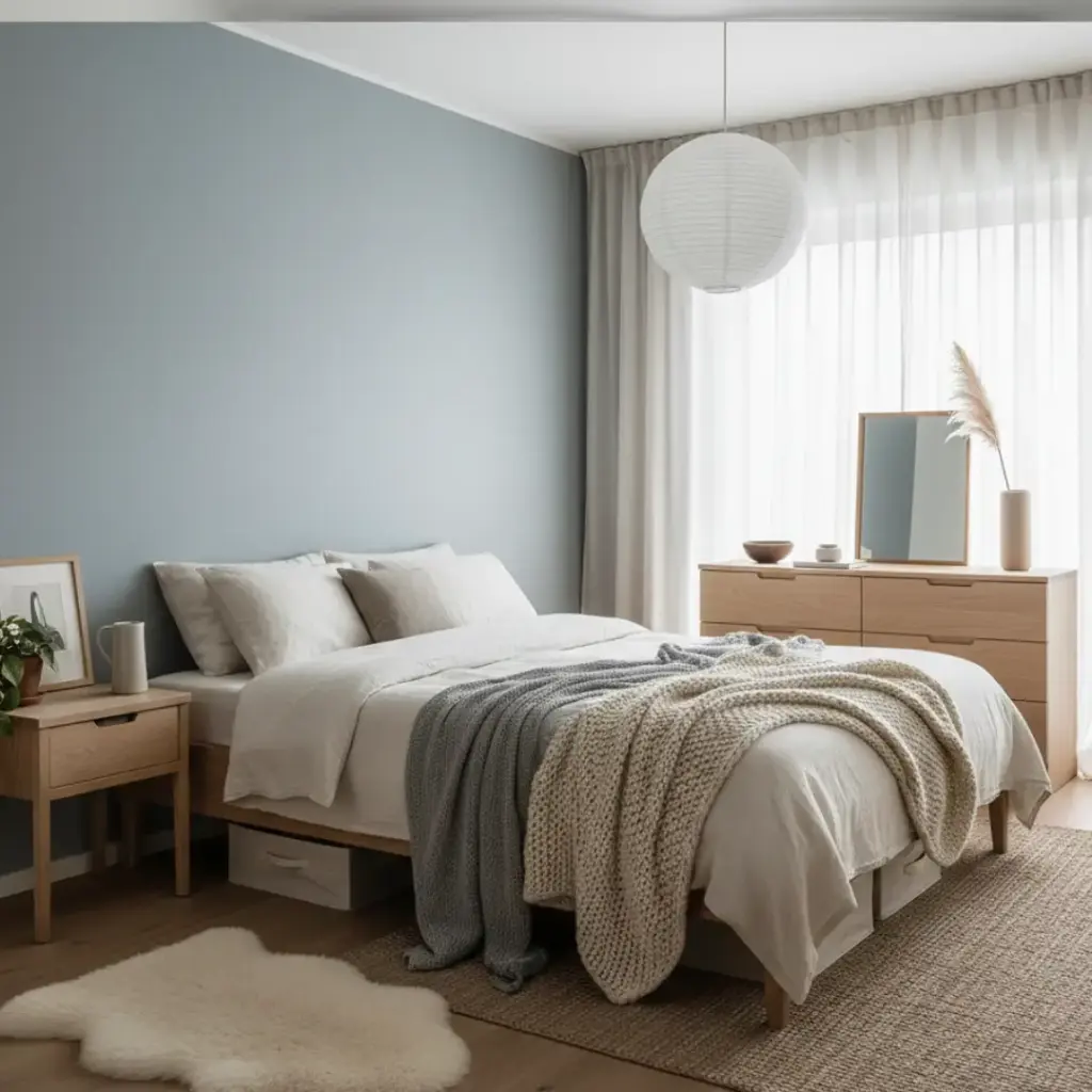 Furniture in a cozy Nordic bedroom style should feel like it actually came from a forest. I prefer light woods like ash or pine over dark, heavy mahoganies.