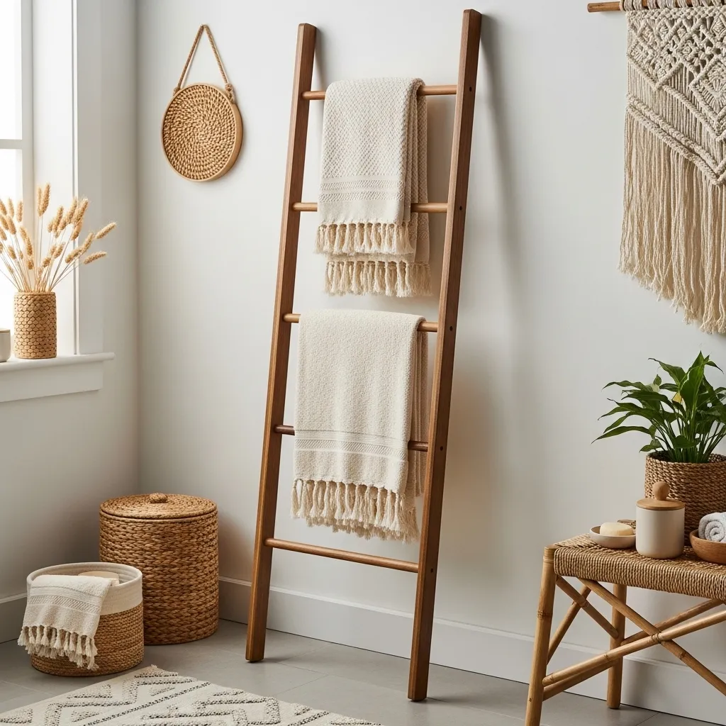 Instead of boring wall racks, try a leaning wooden ladder. It’s a classic boho move that fits perfectly in a minimalist layout because it’s so simple. It adds height to the room and keeps your towels off the floor. FYI, this is also a great way to display those fancy fringed towels.