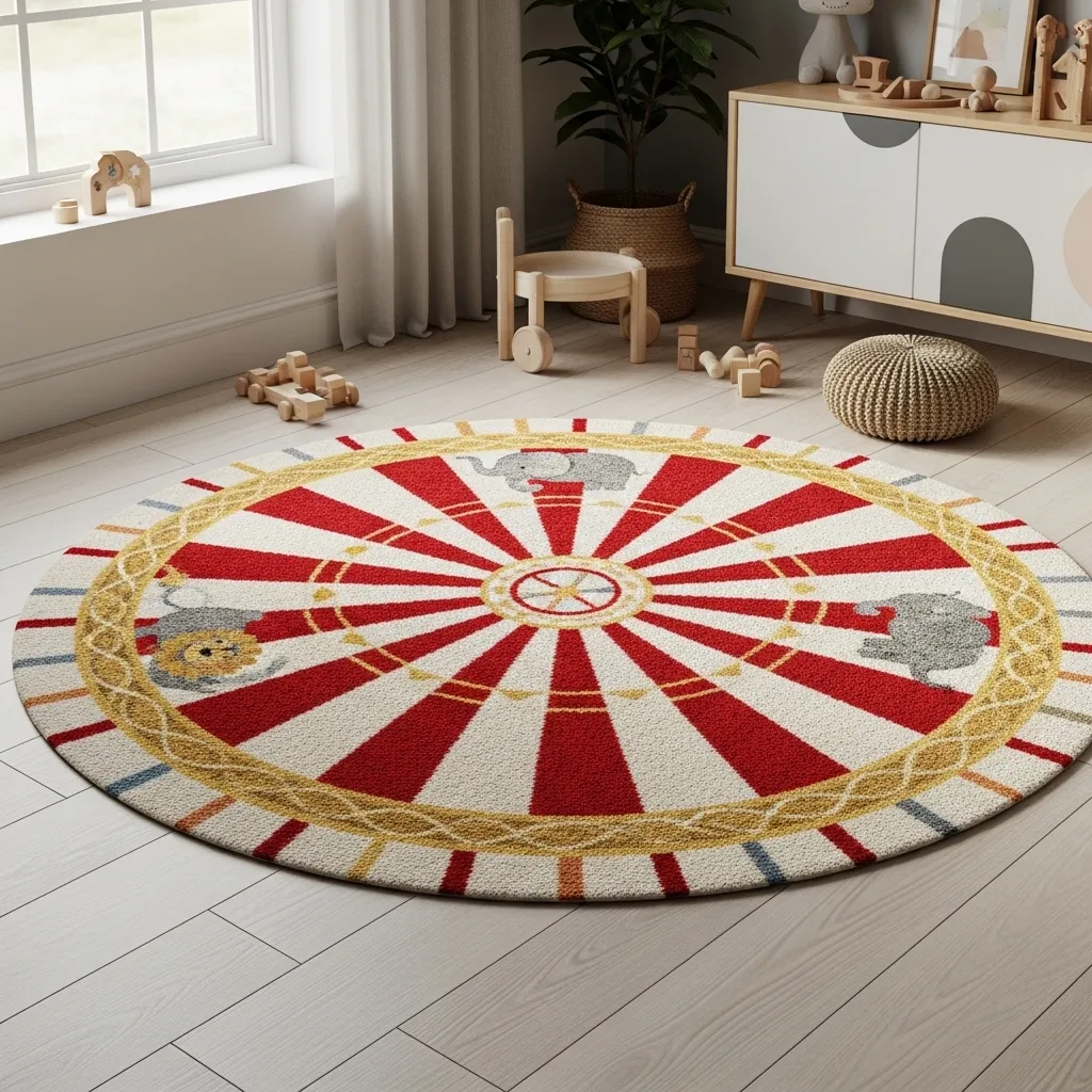 - Rugs featuring playful illustrations of circus animals like elephants or lions.